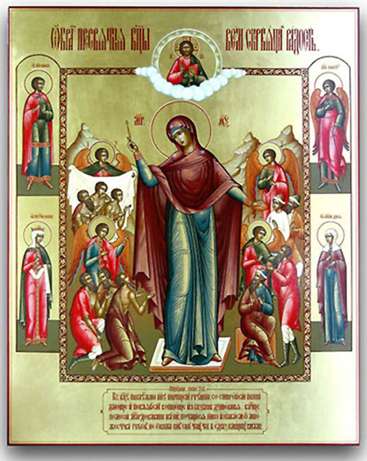 Всех скорбящих Радосте,/ и обидимых Заступнице,/ и алчущих Питательнице,/ странных утешение,/ обуреваемых пристанище,/ больных посещение,/ немощных покрове и Заступнице,/ жезле старости,/ Мати Бога Вышняго Ты еси, Пречистая:// потщися, молимся, спастися рабом Твоим.