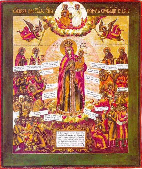 — Есть в храме Преображения Сына Моего образ Мой, именуемый «Всех скорбящих Радость». Стоит он на левой стороне в трапезе, где обыкновенно становятся женщины. Призови к себе из этой церкви священника с этим образом, и когда он отслужит молебен с водосвятием, ты получишь исцеление.