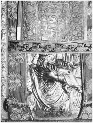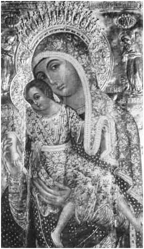 Возможно вид Богородицы в русском кокошнике стал настолько возмутительным в глазах вооруженных скалигеровской историей ученых XVII века, что пришлось закрыть икону. Но след кокошника сохранился в самом названии иконы и, как мы видим, в старом окладе 1596 года. Не исключено, что на самой Иконе, если бы ее можно было посмотреть, кокошник изображен еще более откровенно. Более того, возникает много других не менее интересных вопросов. Почему старый оклад оставляет открытым почти все изображение Богородицы, а новый оклад XVIII века глухо закрывает целиком икону? Насколько это можно видеть из-под современного покрова. Может быть, на Иконе кроме русского кокошника было нарисовано еще много интересного? Например, надписи, символы на одежде и т.п. Было бы очень полезно посмотреть на старую Икону. Если вообще она сохранилась. Не показывают ли сегодня на Кипре только новый оклад и современный покров на нем?