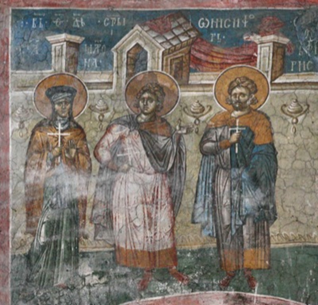 Святые мученики Онисифор и Порфирий жили в царствование Римского императора Диоклитиана. Во время жестокого гонения, воздвигнутого этим нечестивым царем на христиан, и они сподобились претерпеть за Христа тяжкие мучения. Их подвергнули бесчеловечному биению по всему телу и многоразличным, страшным истязаниям. После того мучители положили страстотерпцев Христовых на длинные сковороды и, разведши огонь, жгли их. Наконец, их привязали к свирепым, диким коням. Влачимые ими по каменистой и неровной почве, святые мученики были совершенно растерзаны и в таких мучениях предали души свои Богу. Верующие ночью тайно собрали останки их и с честью погребли в селении Пангианском, где от них стали истекать многоразличные чудеса и исцеления, во славу дивного во святых Своих Бога в Троице славимого1.